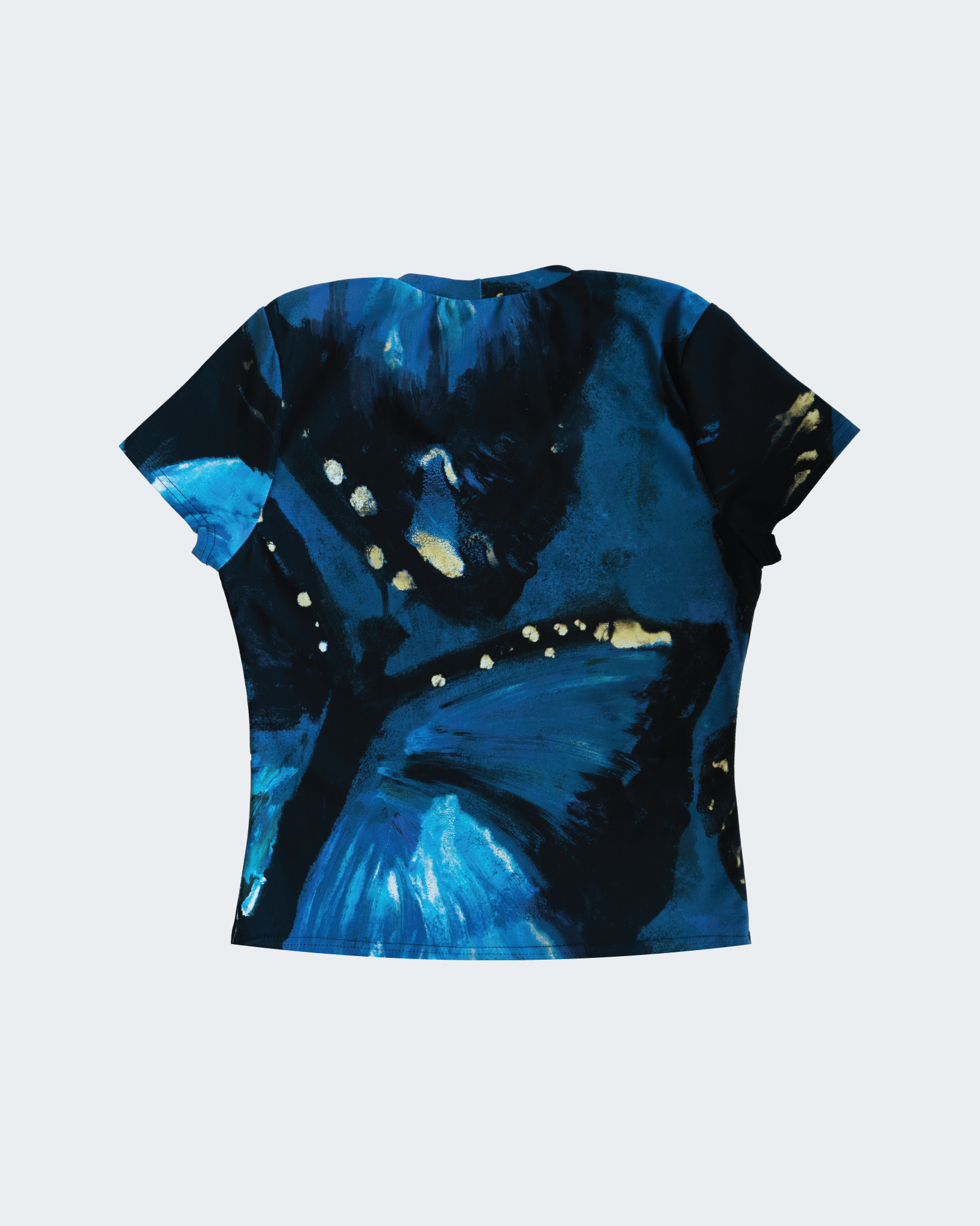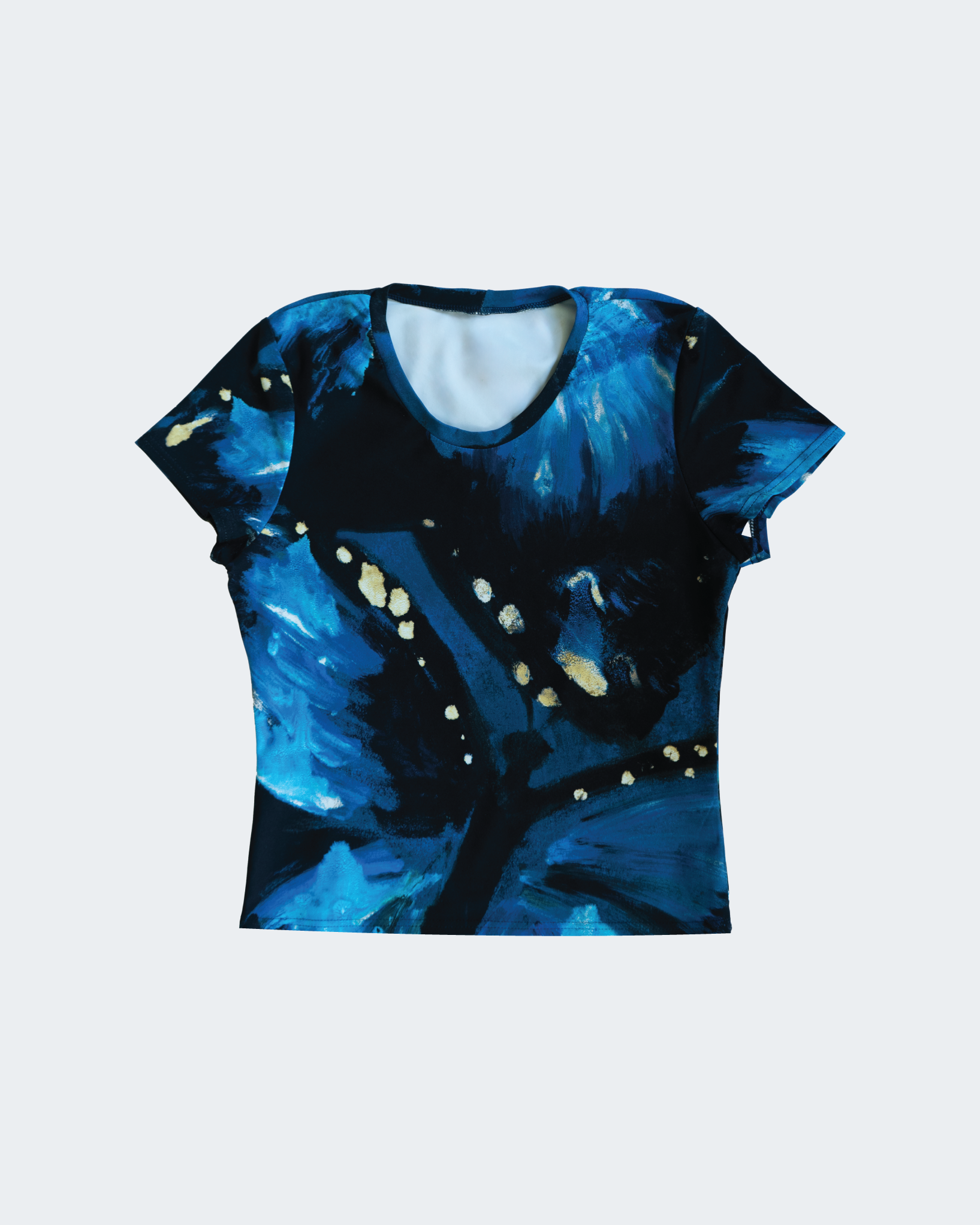 The Marina Baby Tee is cut from medium-weight recycled stretch fabric. It features short sleeves, a cropped length, and a crew neckline.