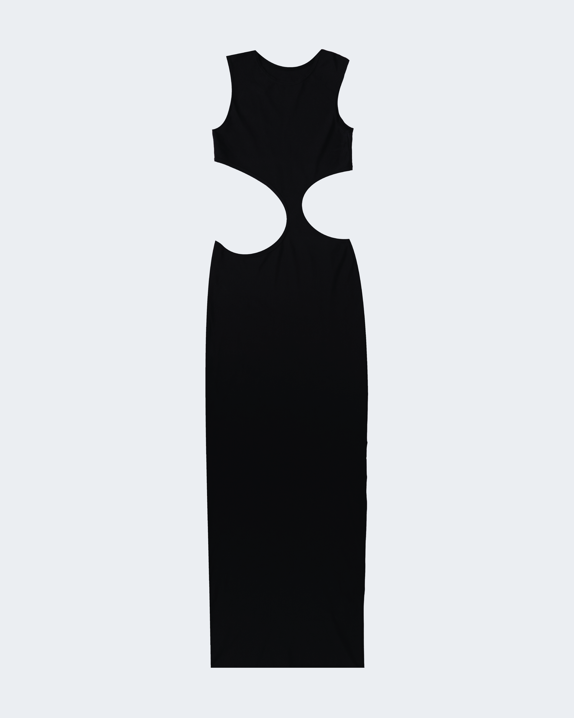 Long Eclipse Cut-Out Gown in Obsidian. Silhouette features asymmetrical cutouts, open back and side slit for mobility. Cut from recycled nylon and made in Los Angeles, CA. Available in 3 lengths.