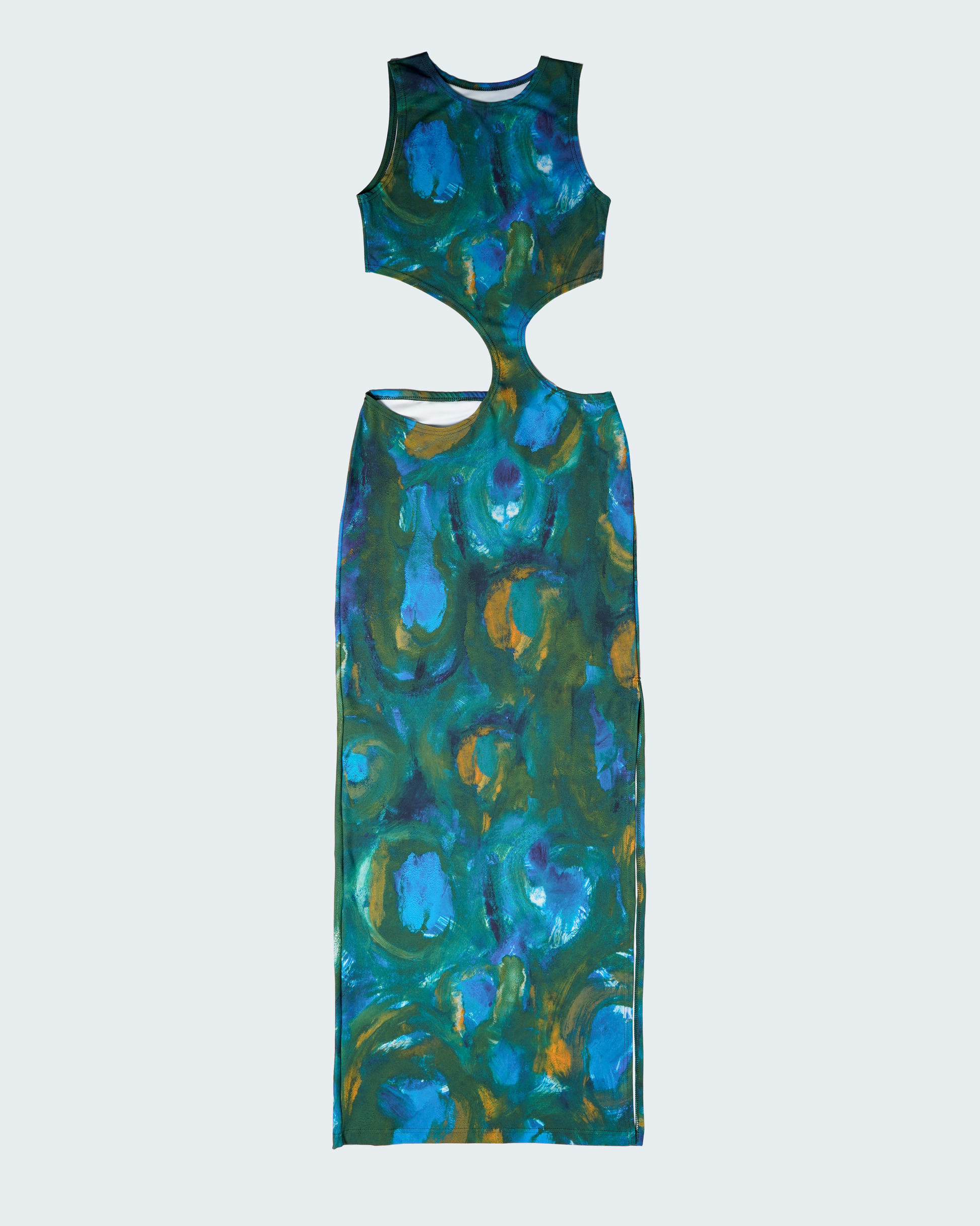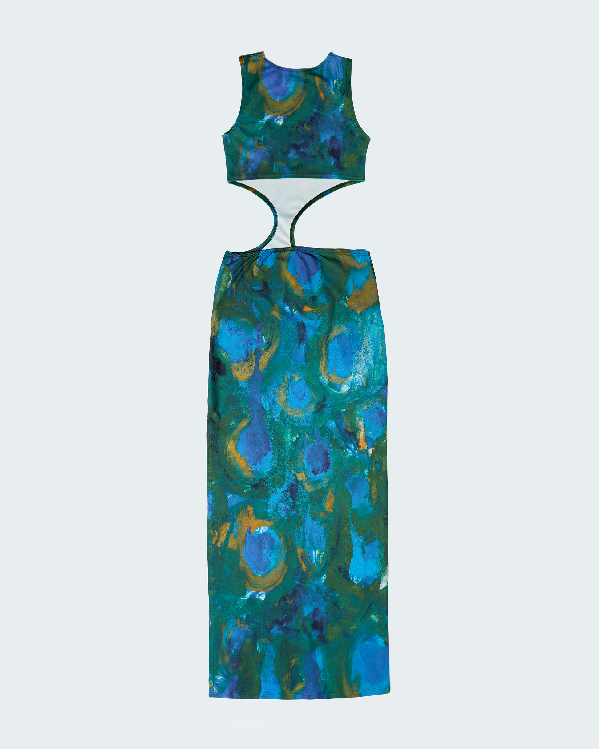 Long Eclipse Cut-Out Gown in Peacock. Silhouette features asymmetrical cutouts, open back and side slit for mobility. Cut from recycled nylon and made in Los Angeles, CA. Available in 3 lengths.