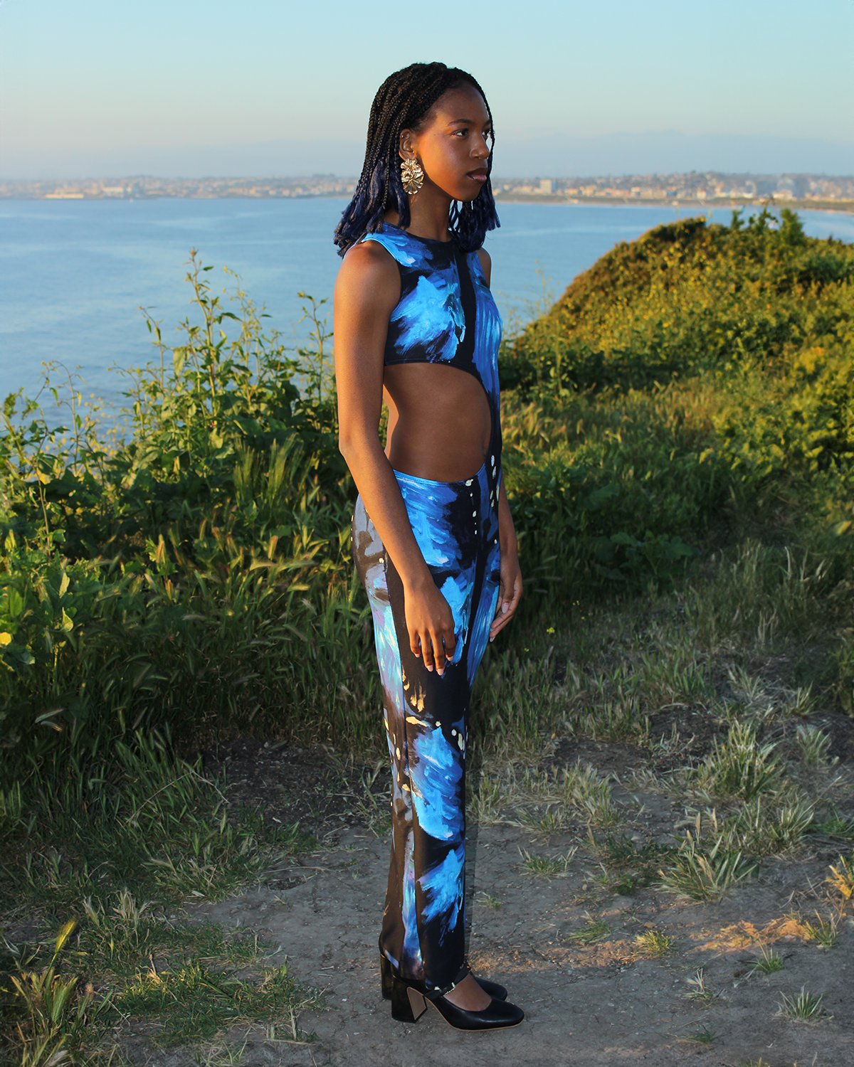 Long Eclipse Cut-Out Gown in Blue Butterfly. Silhouette features asymmetrical cutouts, open back and side slit for mobility. Cut from recycled nylon and made in Los Angeles, CA. Available in 3 lengths.