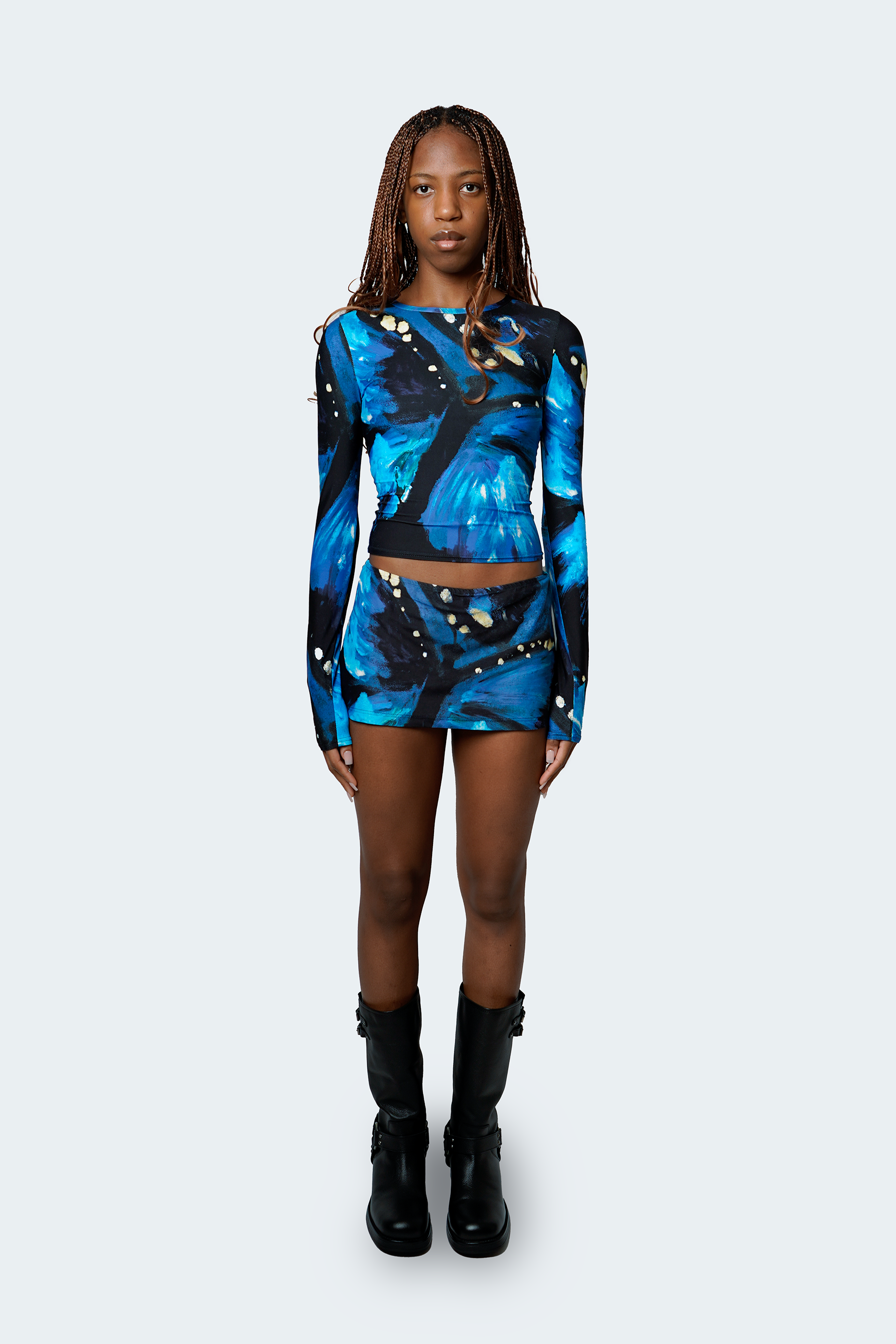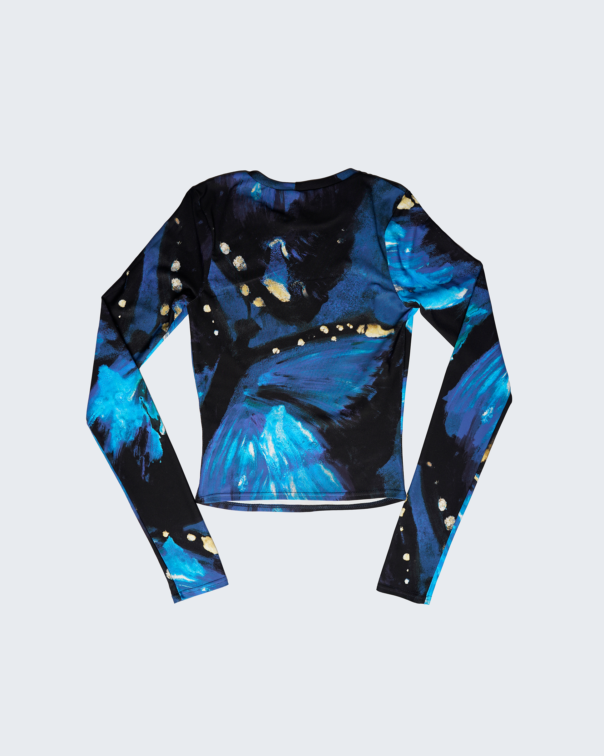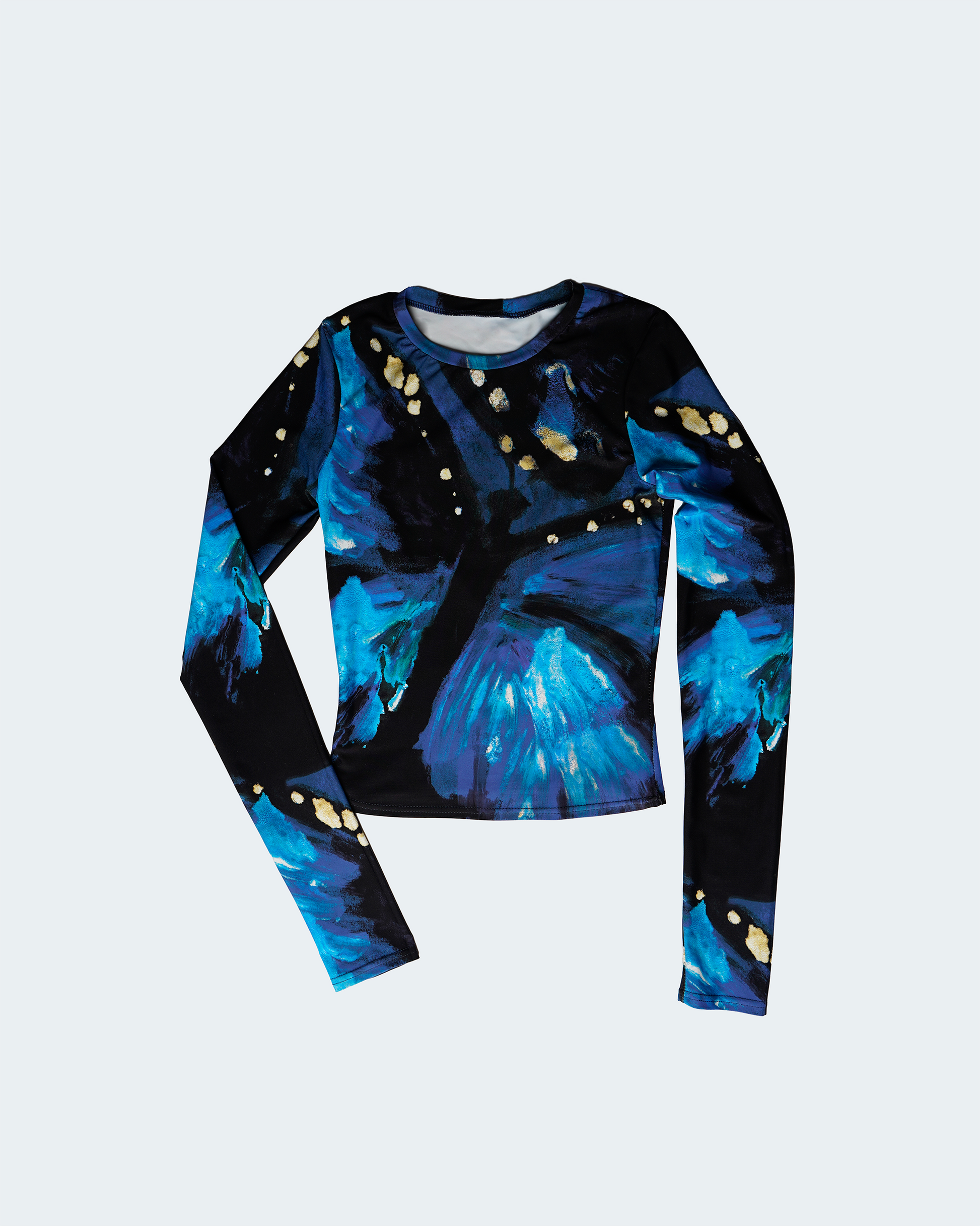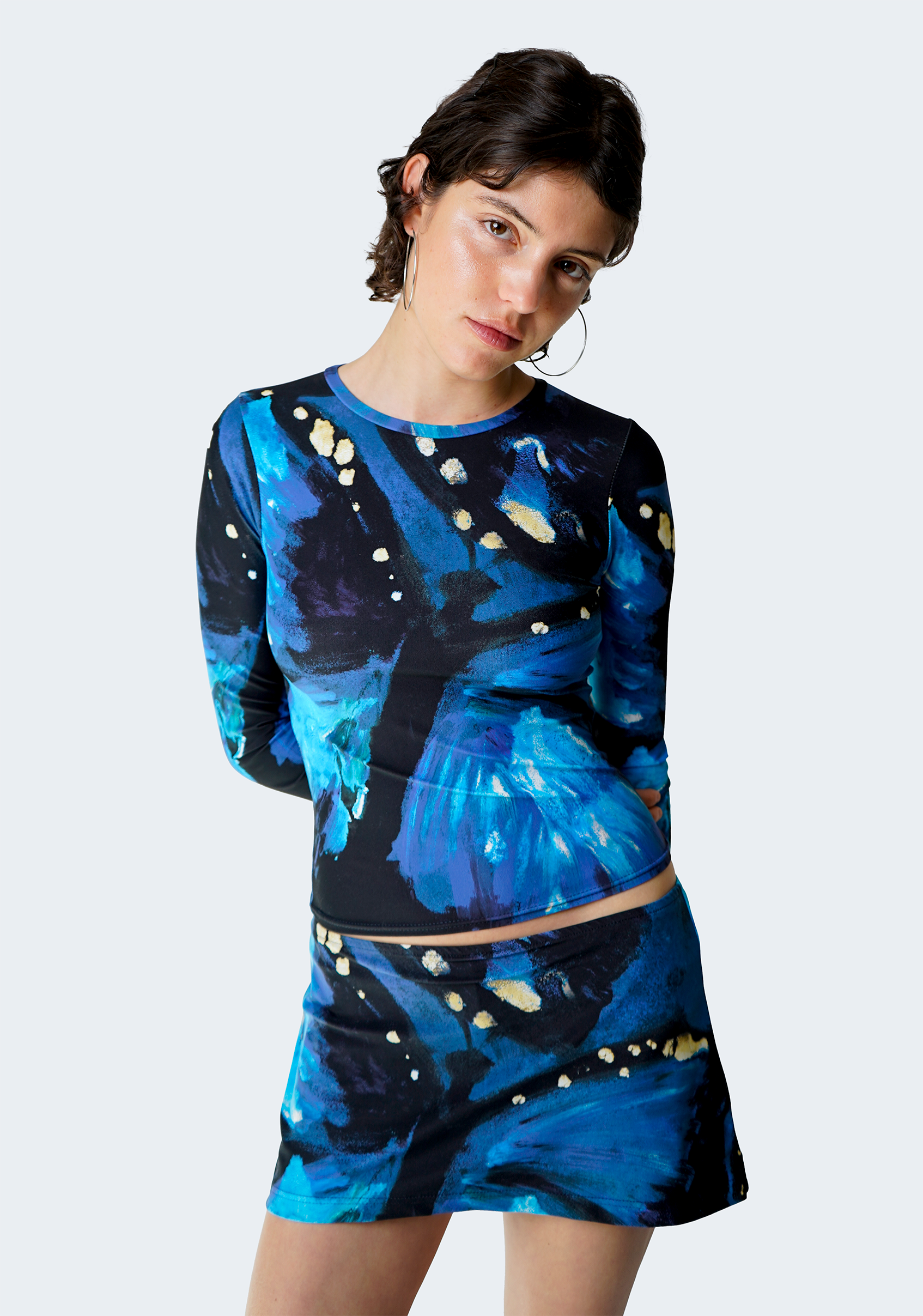 The Long Sleeve Baby Tee is cut from medium-weight recycled stretch fabric. It features short sleeves, a cropped length, and a crew neckline.