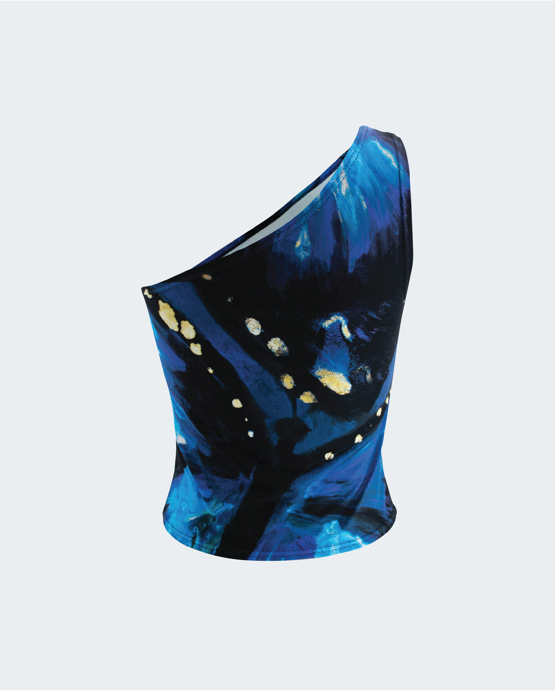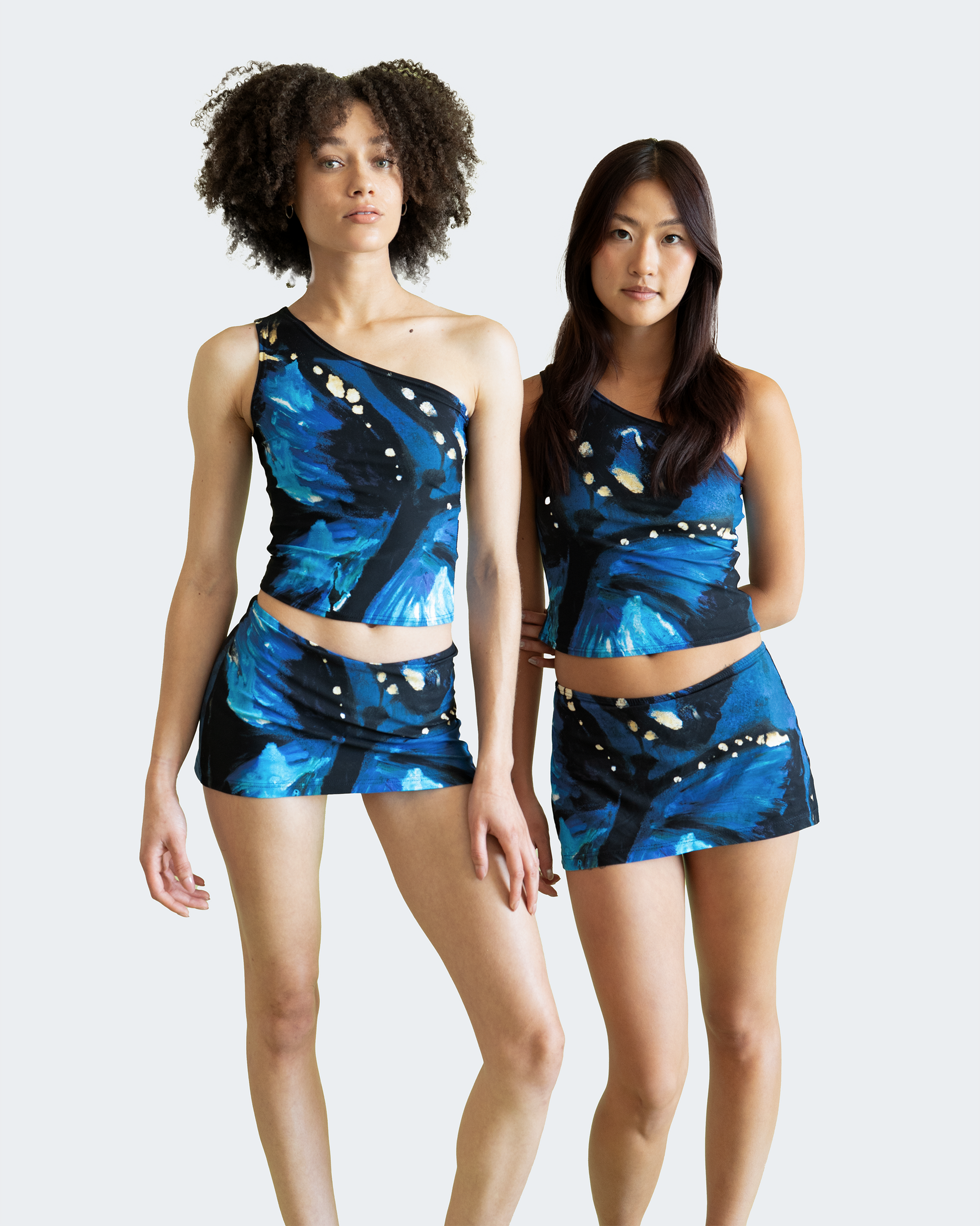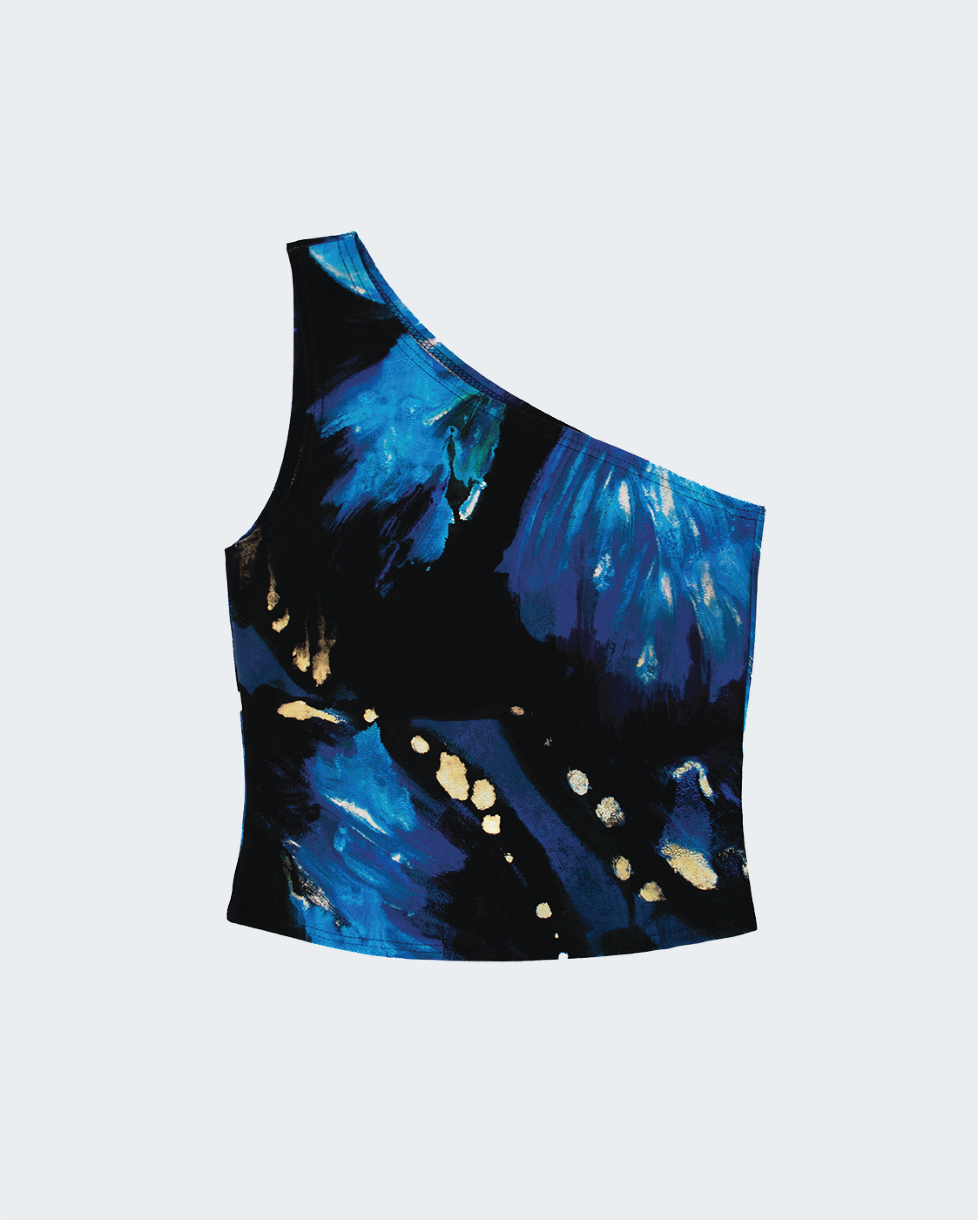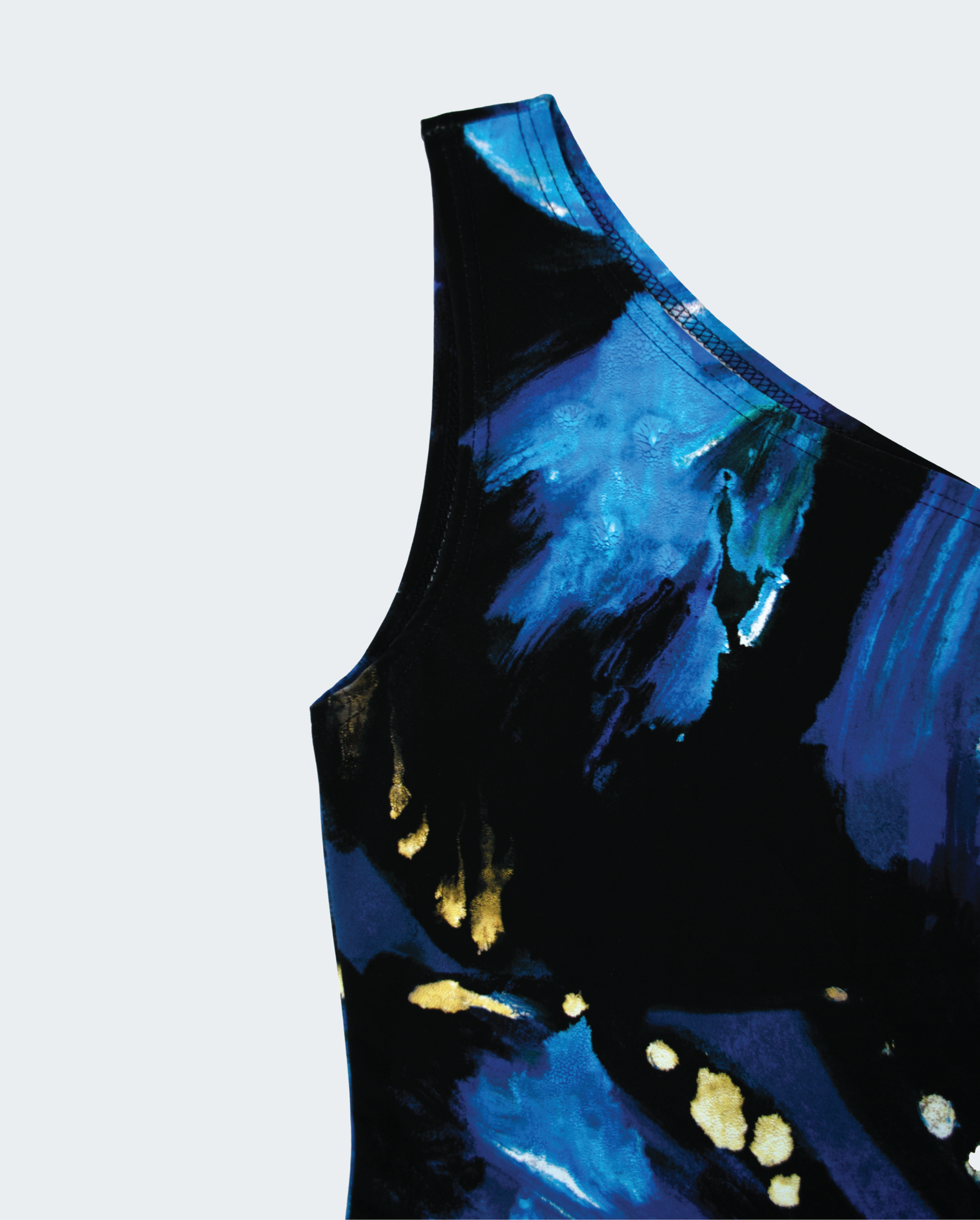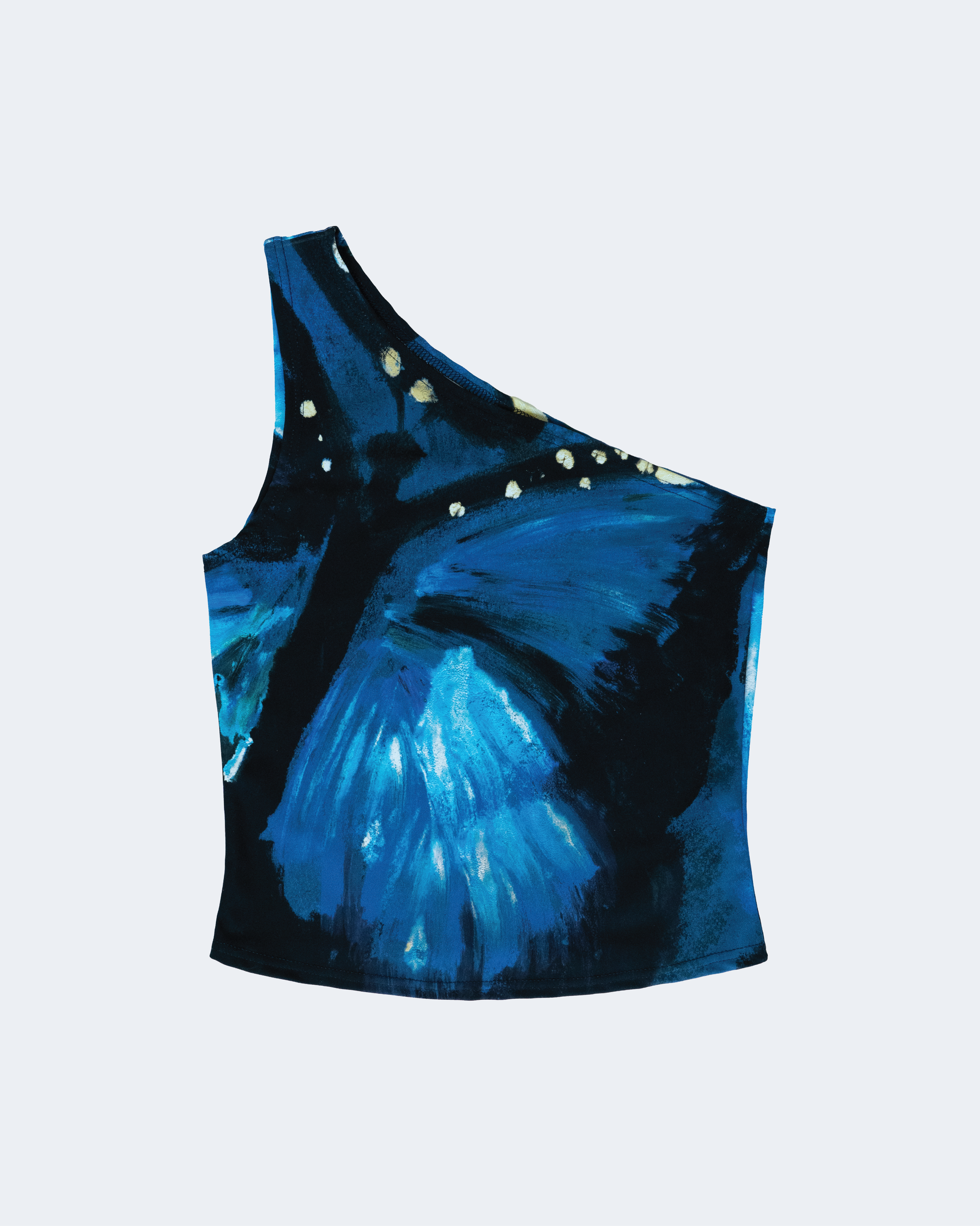 Elegance redefined: Adorned with our stunning Blue Butterfly print, this tank features recycled luxe stretch fabric and an ultra-flattering asymmetric neckline. Ethically made-to-order in Los Angeles, CA.