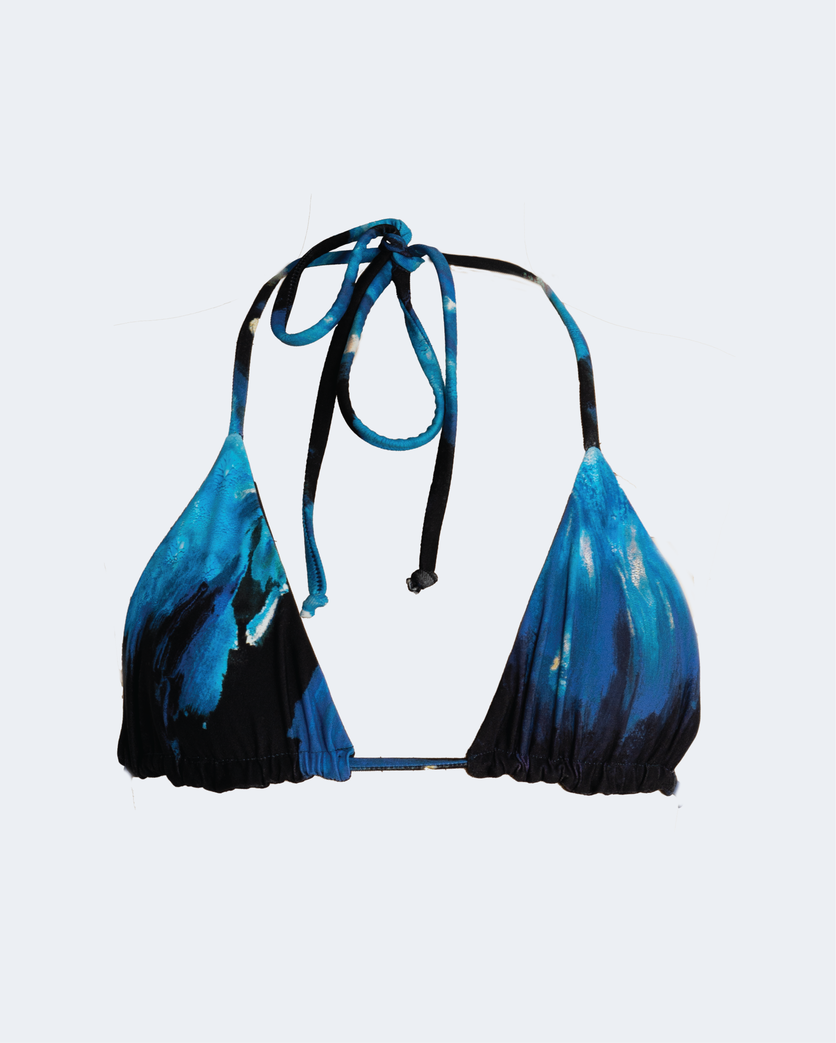 This adjustable drawstring triangle bikini top is crafted from recycled fabric and features an original hand-painted print. Fully lined for comfort and support, it's designed to move with you, perfect for sun-soaked days and ocean dips.
